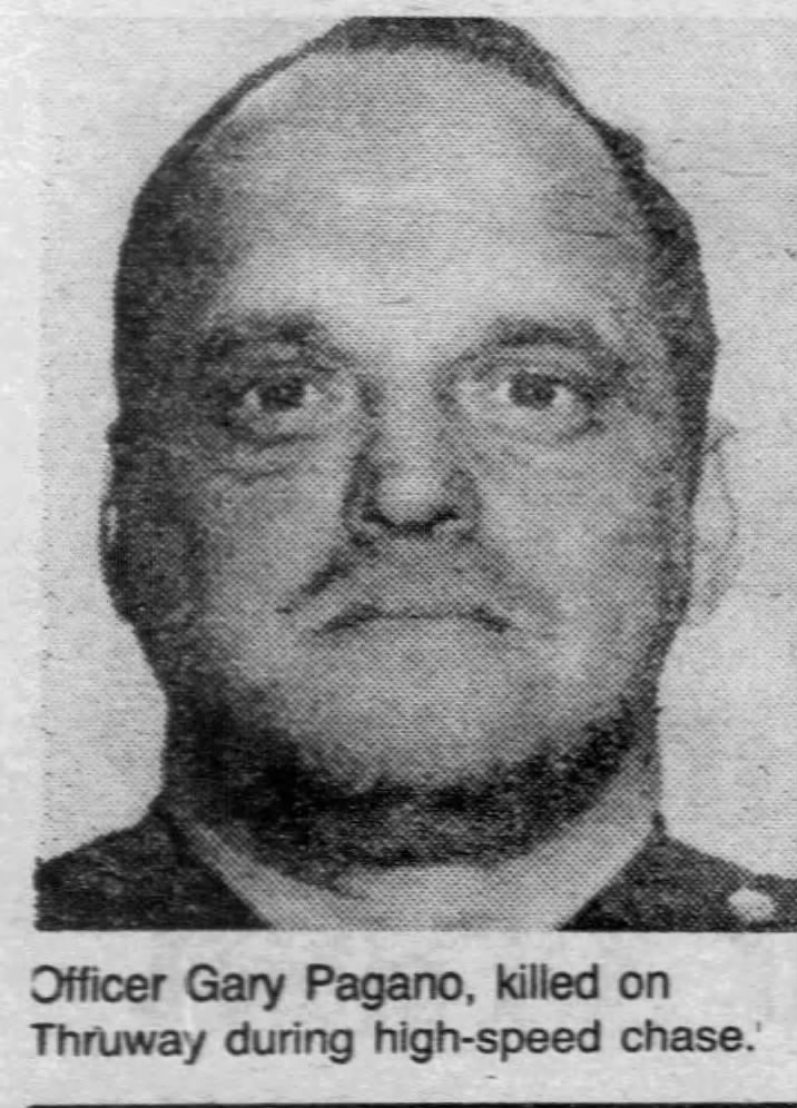 Several suspects had just robbed a house and tied up its occupants and they were being pursued by Officer Pagano and his partner. They were traveling at a high rate of speed on the New England Thruway, when the patrol car went off the road, struck an abandoned truck, and burst into flames. Officer Pagano’s partner was able to escape but was severely injured. The suspects were later caught and convicted.