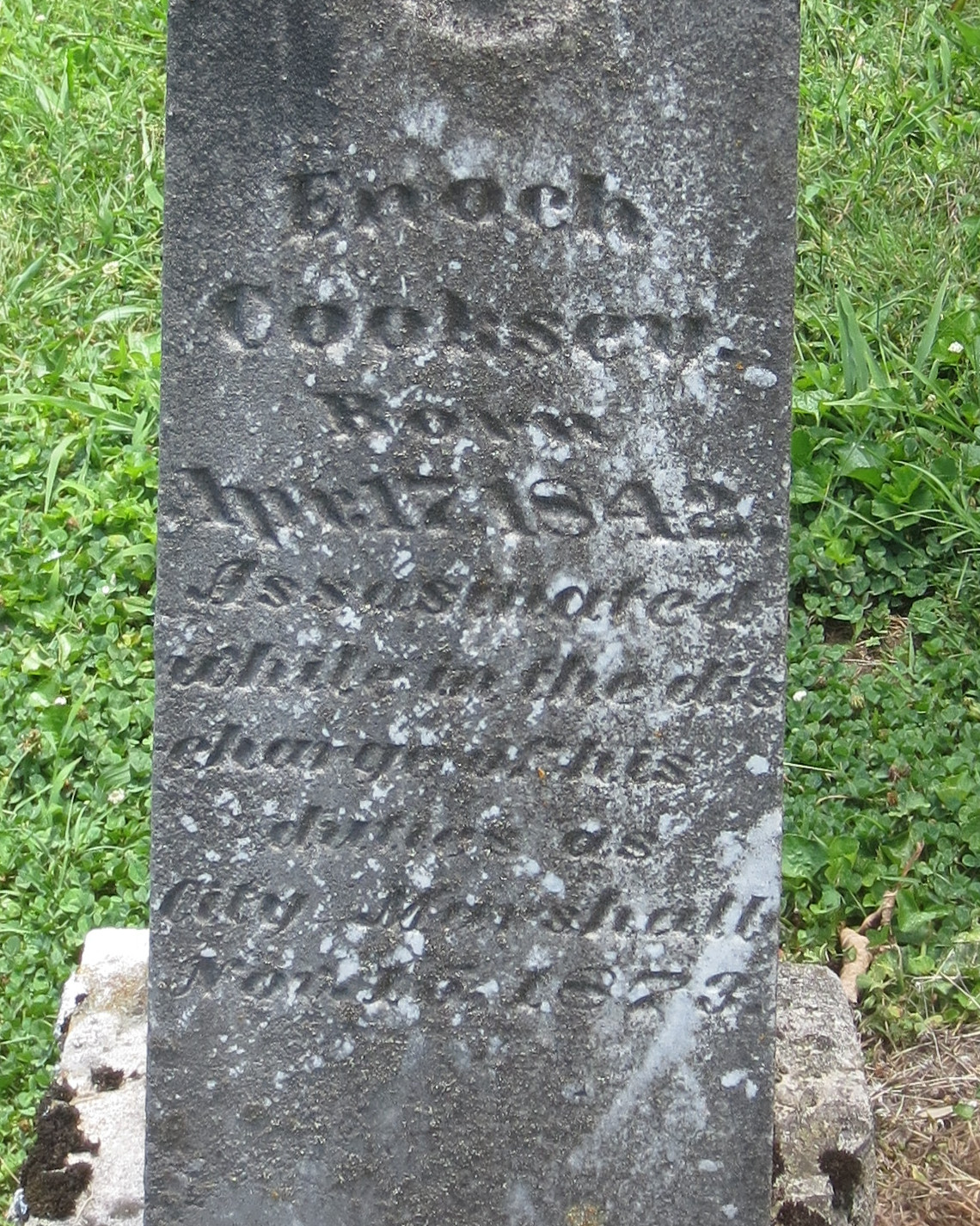 Town Marshal Enoch Cooksey was shot and killed while attempting to quell a disturbance near the center of town on Depot Street around 10:30 p.m.