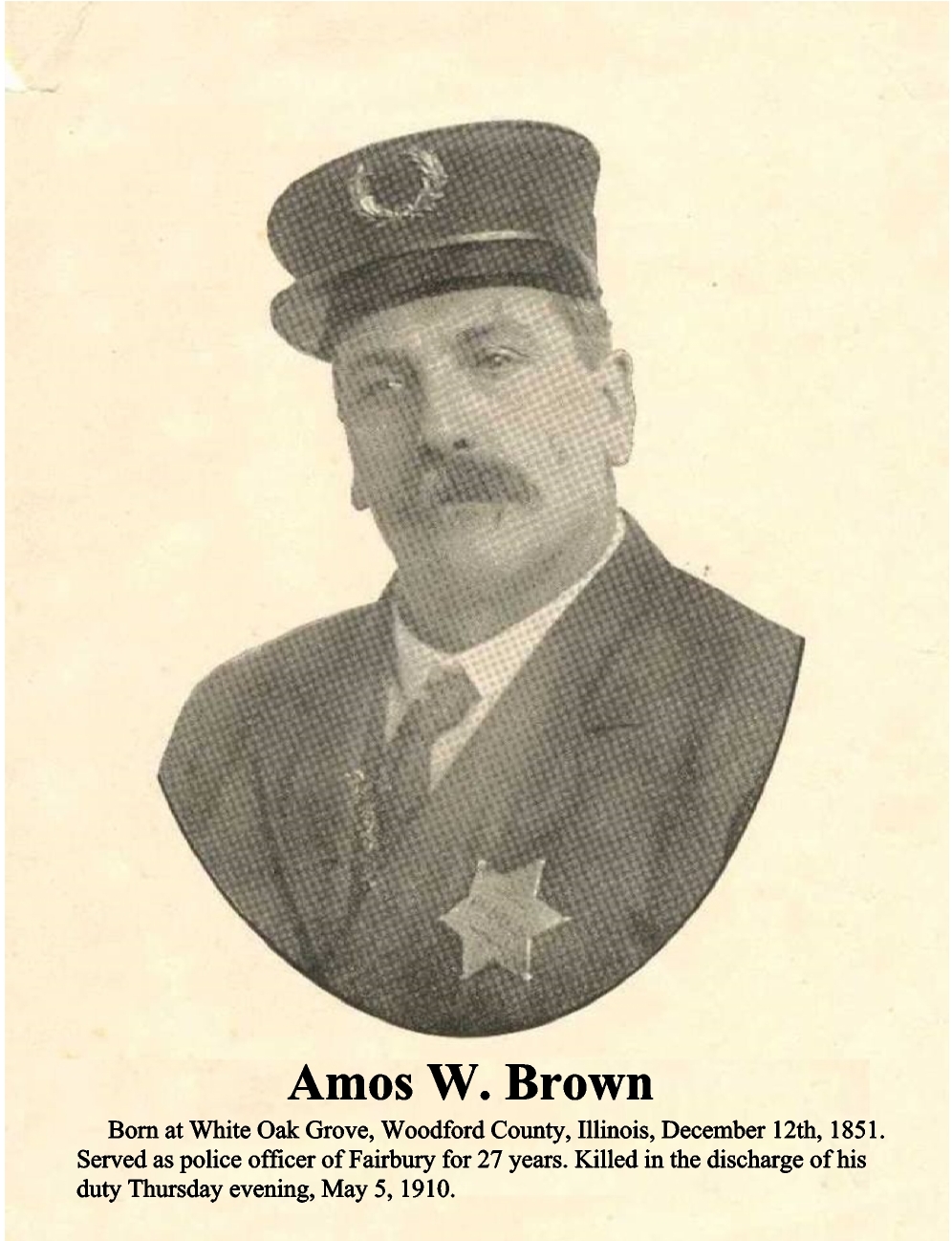 Marshal Brown served with the Fairbury Police Department for 11 years and had been appointed to the position after Chief William Baird was shot and killed in the line of duty in 1899.