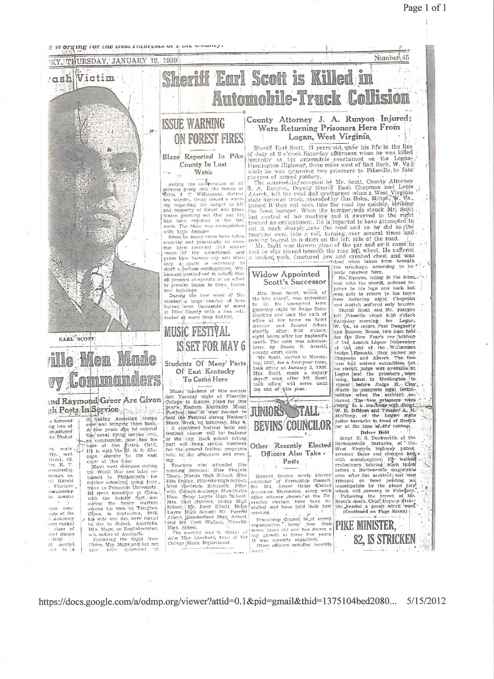 Sheriff Earl Scott was killed in an automobile crash on the Logan-Huntington Highway near Salt Rock, Cabell County, West Virginia.
