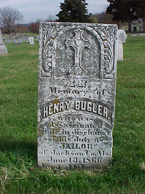 Jailer Bugler is buried in Woodlawn Cemetery, Independence, Jackson County, Missouri.