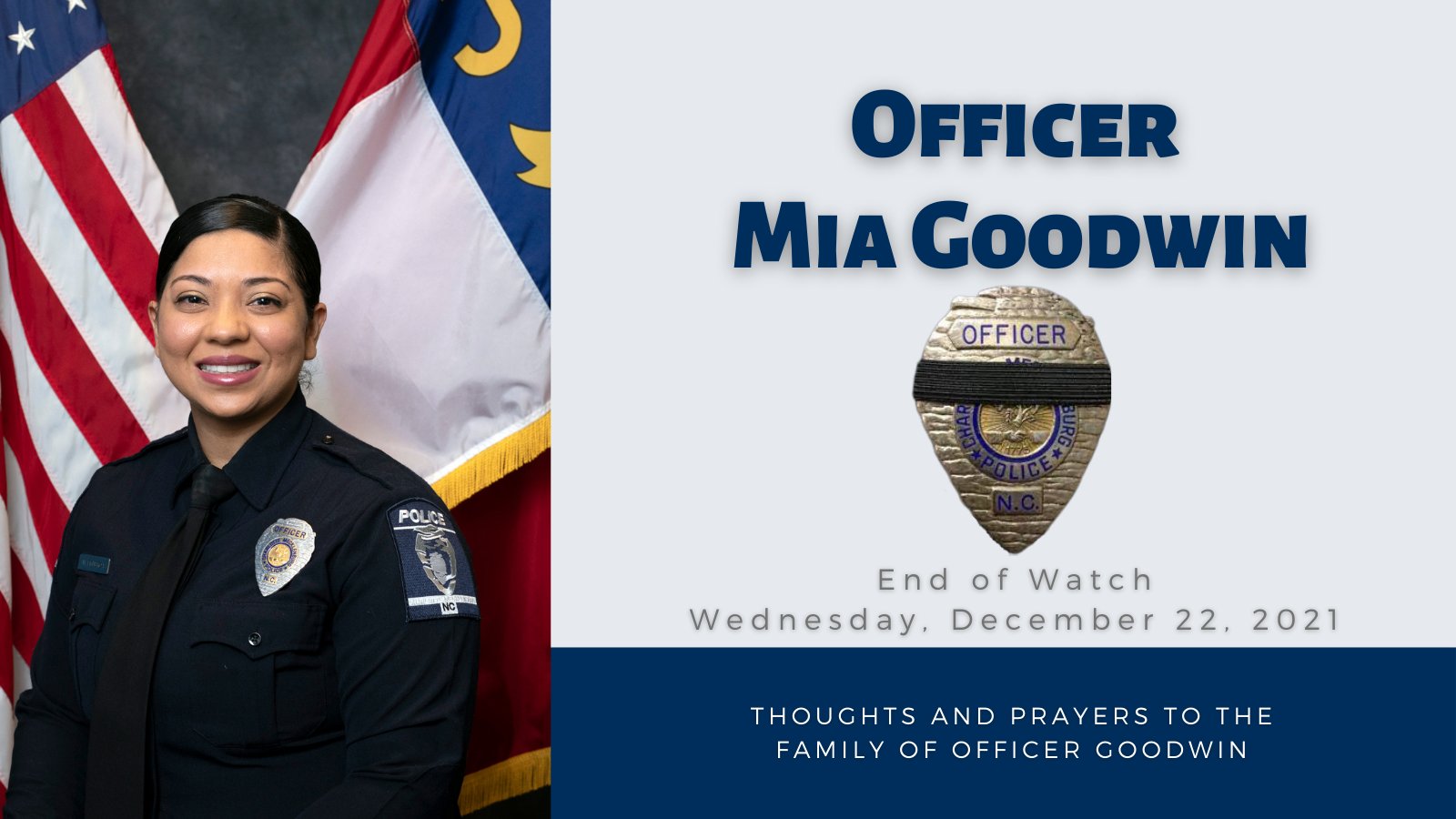 Officer Figueroa-Goodwin had served with the Charlotte-Mecklenburg Police Department for over six years and was assigned to the University City Division. She is survived by her husband and three children, ages 3, 1, and 4 months.