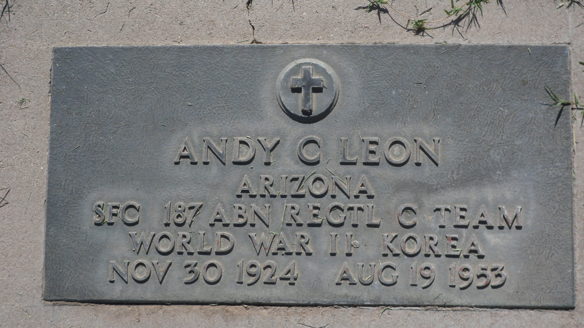 Sergeant First Class Leon was a World War II and Korean War veteran and was assigned to the 187th Airborne Infantry Regiment. He is buried at the South Lawn Cemetery in Tucson, Arizona. He is survived by his wife, daughter, son, two sisters, and four brothers.
