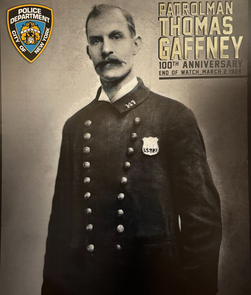 Patrolman Thomas Gaffney was killed while he and another officer were assisting a motorist with a stalled car on the Manhattan Bridge. The stalled car was struck by a passing vehicle, throwing it into Patrolman Gaffney.