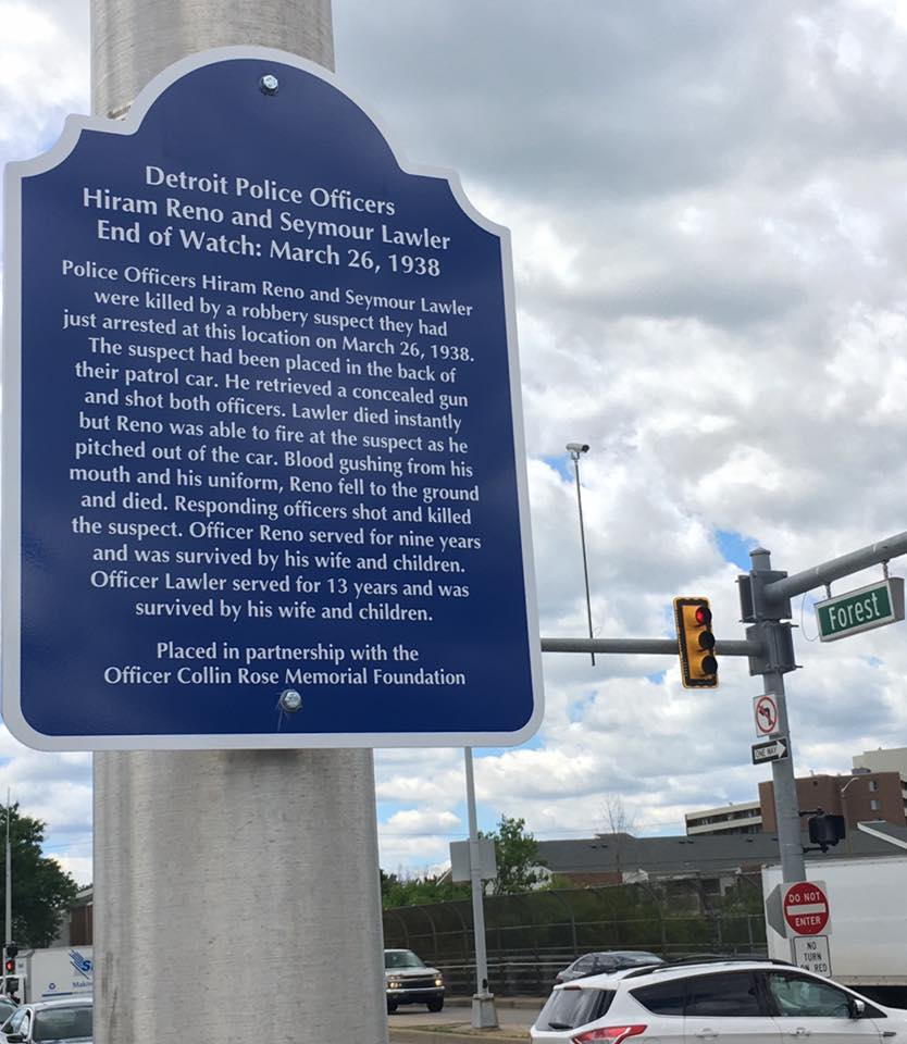 Police Officer Seymour Lawler and Police Officer Hiram Reno were shot and killed by a robbery suspect they had just arrested at 1002 W. Forest Avenue near Hamilton and Forrest Avenues. The man had been placed in the back of the officers' patrol car.