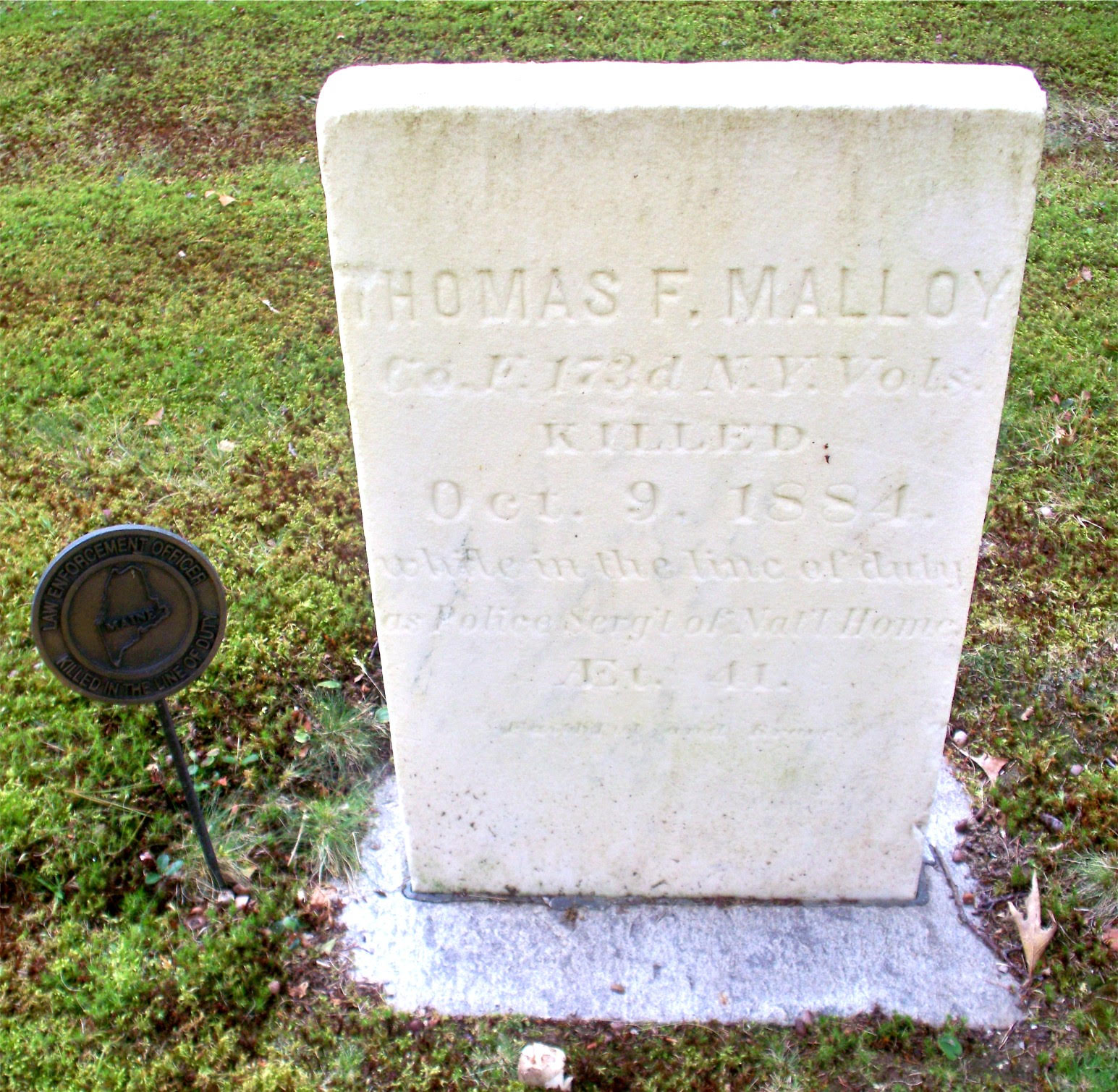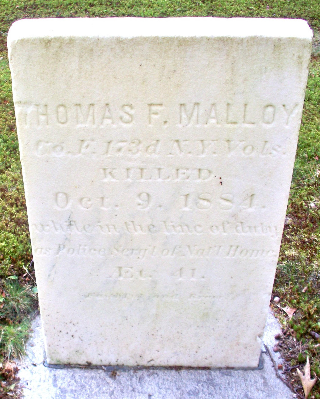 He was a Union Civil War Veteran who served as a private in the 173rd New York Infantry, Company F. On June 14, 1863, he was shot in the left arm during the siege of Port Hudson, Louisiana, and was released and sent home. His wound came after an attack by the Union Army on the Port Hudson fort, which was repulsed by the rebels resulting in heavy Union losses. Sergeant Malloy was an inmate at the National Soldiers Home in Sodus, Maine, and was appointed a Special Sergeant by the Sheriff.